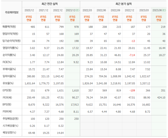 2022년 매출은 799억, 영업이익은 168억, 당기순이익은 192억입니다. 그리고 영업이익률은 21.05%입니다.
