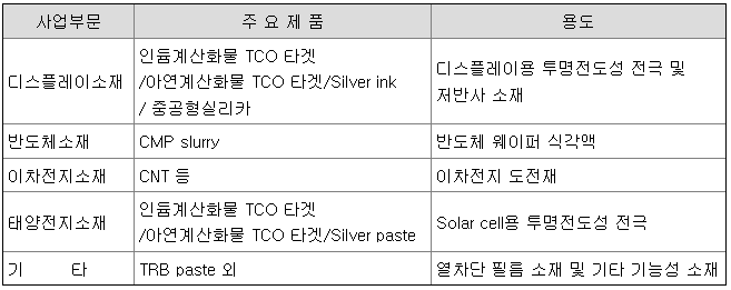 이러한 기술을 통해서 디스플레이 패널시장 및 태양전지 시장, 반도체 CMP공정에 투입되는 소재 제조 그리고 이차전지 전극에 적용되는 CNT도전재를 주요 사업으로 영위하고 있습니다.