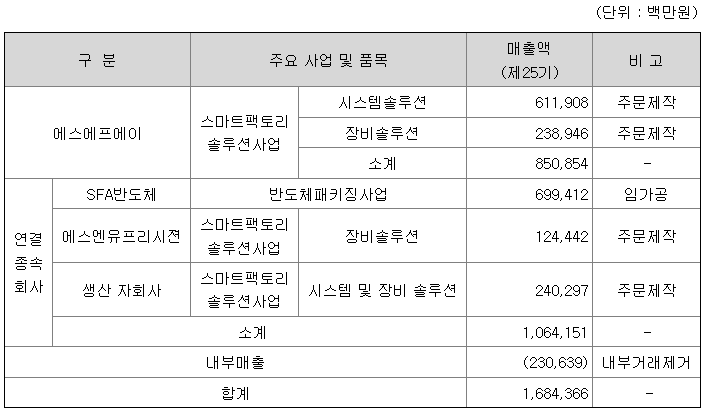 스마트팩토리솔루션사업은 당사, 에스엔유프리시젼 및 SFA반도체를 제외한 기타의 종속회사가 영위하고 있는 사업 부문으로서, 이차전지, 반도체, 유통, 디스플레이, Glass 산업 부문에서 필요로 하는 물류시스템 및 다양한 공정장비를 공급하고 있습니다. 여기에 당사가 자체적으로 개발한 스마트기술을 접목한 최첨단 스마트팩토리 장비를 기반으로 보다 더 큰 성장동력이 활성화되는 이차전지 및 유통 산업과 장비시장규모가 현격하게 큰 반도체산업 등의 비디스플레이산업부문으로 사업 영역을 확장하여 사업성과 안정성 등을 확보함은 물론 성장동력도 함께 확보하기 위한 노력을 기울이고 있습니다.