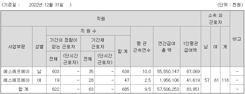 | 사업부문 | 성별 | 직원수 | 평균근속연수 | 평균연봉(백만) |