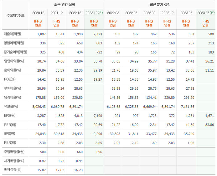 2022년 매출은 1948억, 영업이익은 659억, 당기순이익은 434억입니다. 그리고 영업이익률은 33.84%입니다.