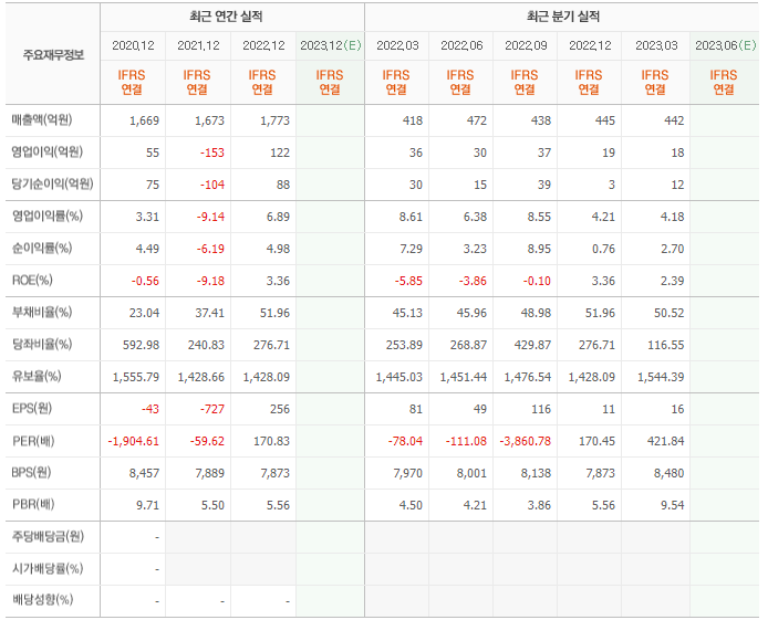 2022년 매출은 1773억, 영업이익은 122억, 당기순이익은 88억입니다. 그리고 영업이익률은 6.89%입니다.