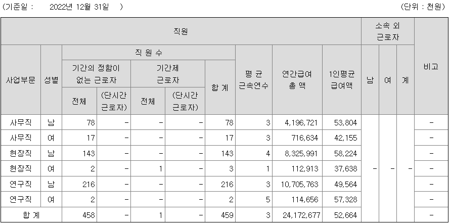 전체 평균연봉은 5200만원이고 직원수는 459명입니다.