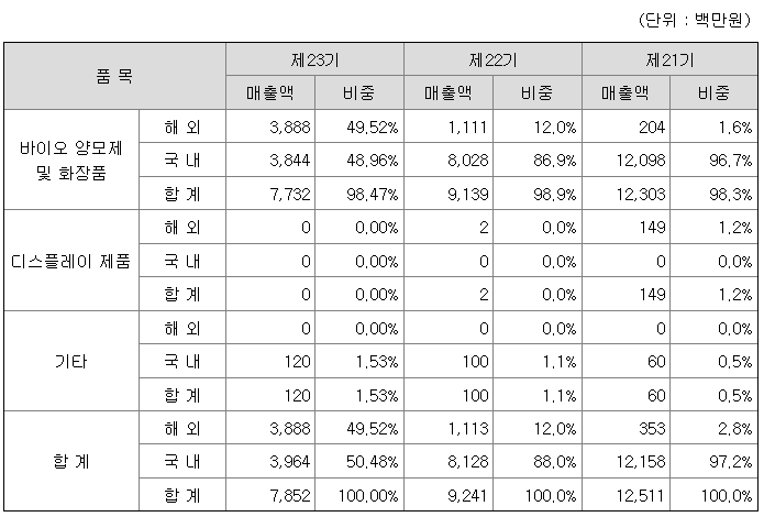 당기 매출액은 연결재무제표 기준 7,852백만원이며, 전체 매출액의 대부분은 바이오 화장품, 양모제 판매입니다.