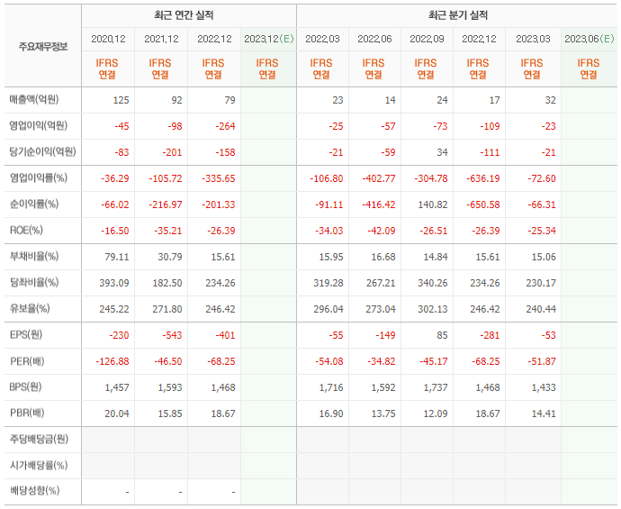 2022년 매출은 79억, 영업이익은 -264억, 당기순이익은 -158억입니다. 그리고 영업이익률은 -335.65%입니다.
