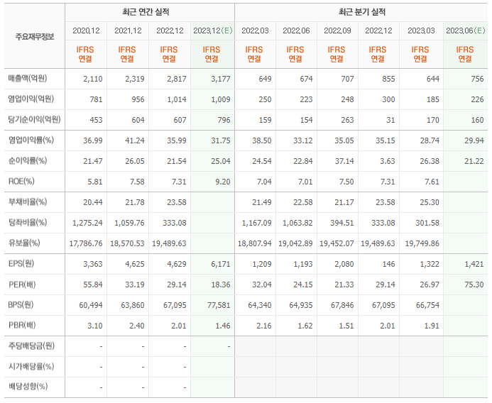 2022년 매출은 2817억, 영업이익은 1014억, 당기순이익은 607억입니다. 그리고 영업이익률은 35.99%입니다.