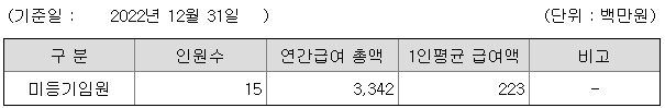 미등기임원의 평균연봉은 2억 2300만원이고 직원수는 15명입니다.