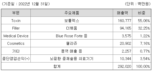 2018년 01월 31일 100% 자회사였던 판매 전문 법인 휴젤파마㈜를 흡수합병하여 보고서 작성기준일 현재 내부조직인 영업마케팅본부에서 보툴렉스(보툴리눔 톡신), 더채움(HA필러) 등의 바이오의약품 판매 사업을 영위하고 있습니다.