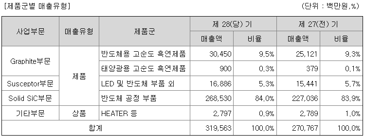 당사에서 생산하는 제품은 반도체 및 태양광 웨이퍼(실리콘웨이퍼)의 제조공정에 사용되는 장비의 부분품과 LED 및 반도체 소자제조 공정 장비용 부분품으로 사용되고 있습니다.