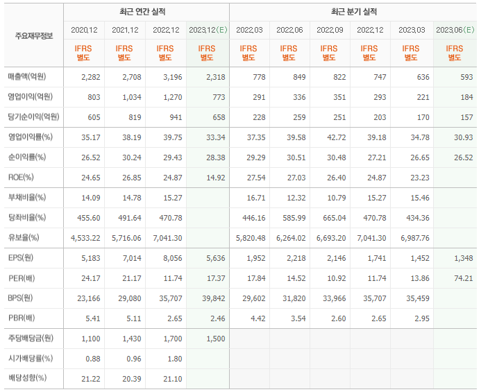 2022년 매출은 3196억, 영업이익은 1270억, 당기순이익은 941억입니다. 그리고 영업이익률은 39.75%입니다.