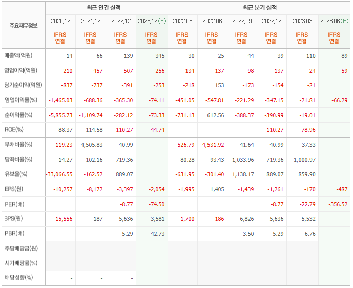 2022년 매출은 139억, 영업이익은 -507억, 당기순이익은 -391억입니다. 그리고 영업이익률은 -365.30%입니다.