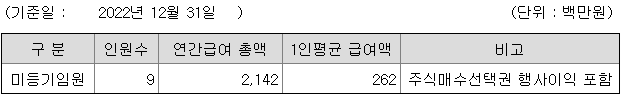 미등기임원의 평균연봉은 2억 6200만원이고 직원수는 9명입니다.