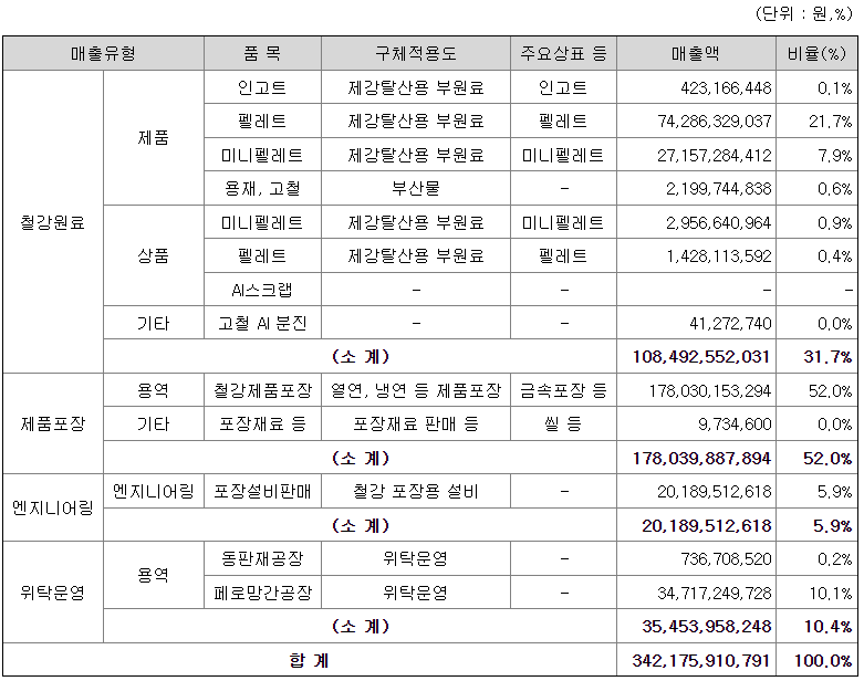 2022년 기준 부문별 매출액 비중은 철강원료 31.7%, 제품포장 52.0%, 엔지니어링 5.9%, 위탁운영 10.4%, 입니다. 철강원료 세부 매출비중은 단순합계 기준으로 펠레트 70%, 미니펠레트 28%이며, 위탁운영 세부 매출액 비중은 페로망간공장 98%, 동판재공장 2% 입니다.