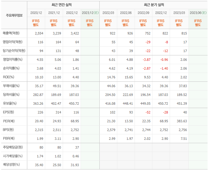 2022년 매출은 3422억, 영업이익은 64억, 당기순이익은 48억입니다. 그리고 영업이익률은 1.86%입니다.