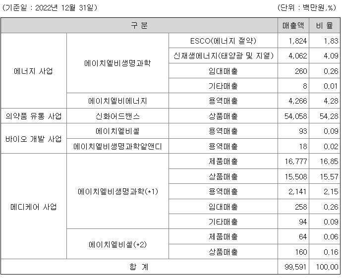 연결회사는 에너지사업, 의약품유통사업, 바이오개발사업, 메디케어사업 부문으로 총 4개 사업부문 체제로 운영되고 있습니다. 각 사업부문별 주요 사업영역은 다음과 같습니다.
