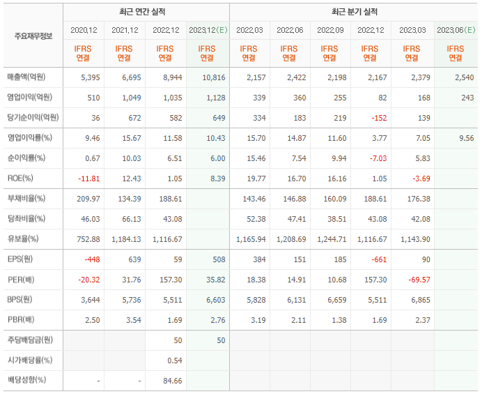 2022년 매출은 8944억, 영업이익은 1035억, 당기순이익은 582억입니다. 그리고 영업이익률은 11.58%입니다.