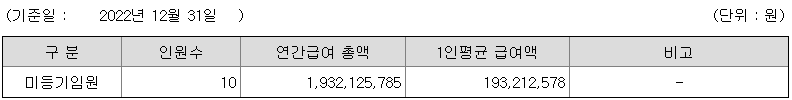 미등기임원의 평균연봉은 1억 9300만원이고 직원수는 10명입니다.