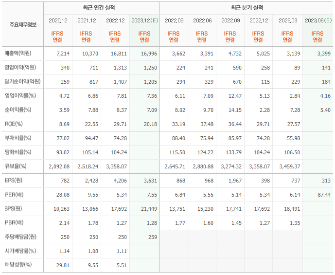 2022년 매출은 1조 6811억, 영업이익은 1313억, 당기순이익은 1407억입니다. 그리고 영업이익률은 7.81%입니다.
