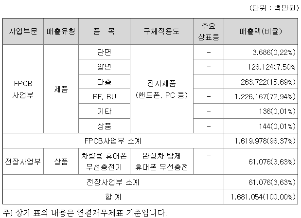 당사의 사업분야는 첨단 IT산업의 핵심부품인 FPCB와 그 응용부품을 전문적으로 제조 및 생산하는 FPCB 사업과 차량용 휴대폰 무선충전기의 개발 및 생산을 주력으로 하는 전장사업부로 분류됩니다.
