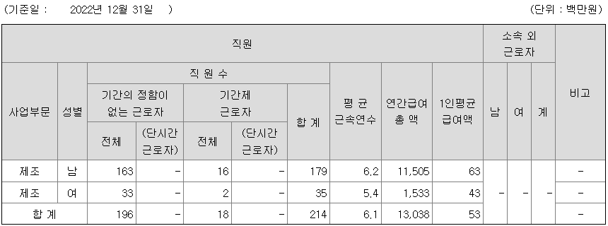 | 사업부문 | 성별 | 직원수 | 평균근속연수 | 평균연봉(백만) |