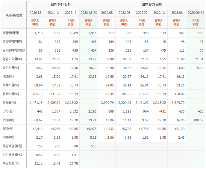 2022년 매출은 1789억, 영업이익은 559억, 당기순이익은 439억입니다. 그리고 영업이익률은 31.24%입니다.
