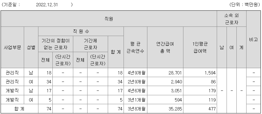 전체 평균연봉은 4억 7700만원이고 직원수는 74명입니다.