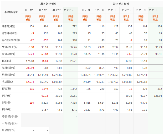 2022년 매출은 492억, 영업이익은 163억, 당기순이익은 164억입니다. 그리고 영업이익률은 33.11%입니다.