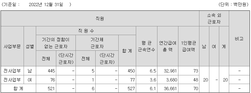 | 사업부문 | 성별 | 직원수 | 평균근속연수 | 평균연봉(백만) |