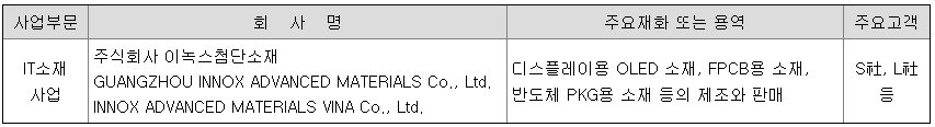 당사는 고분자 합성/배합기술을 기반으로하여 디스플레이용 OLED 소재, FPCB용 소재, 반도체 PKG용 소재등을 개발, 제조 및 판매하는 IT소재 부문을 영위하고 있습니다.