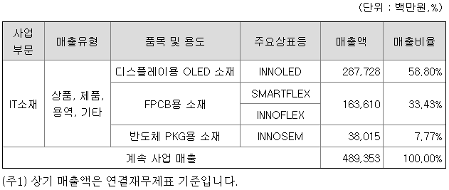 당사는 위에서 언급한바와 같이 디스플레이용 OLED소재, FPCB용 소재와 반도체 PKG용 소재를 주력으로 하고 있는 IT소재 사업부문을 영위하고 있으며, 사업부문에서 세부 제품군별 매출액 및 총매출액에서 차지하는 비율은 다음과 같습니다.
