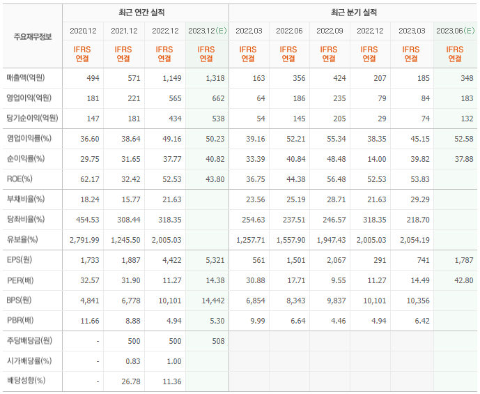 2022년 매출은 1149억, 영업이익은 565억, 당기순이익은 434억입니다. 그리고 영업이익률은 49.16%입니다.