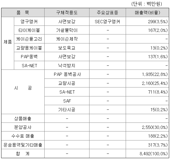 당사는 영구앵커, 타이케이블, 케이슨들고리, 교량용케이블등을 생산, 판매하고 있으며 각 제품별 제28기 매출액 및 총 매출액에서 차지하는 비율은 다음과 같습니다.