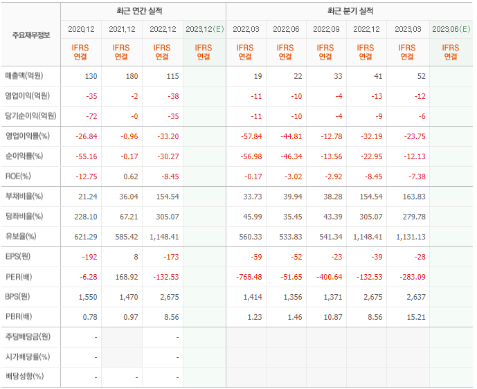 2022년 매출은 115억, 영업이익은 -38억, 당기순이익은 -35억입니다. 그리고 영업이익률은 -33.20%입니다.