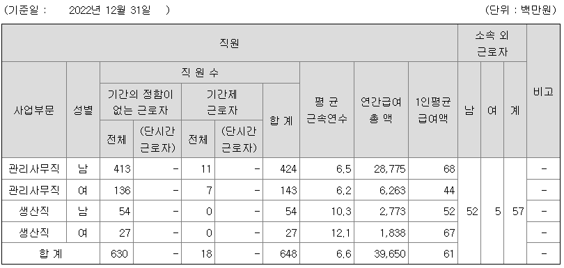 | 사업부문 | 성별 | 직원수 | 평균근속연수 | 평균연봉(백만) |