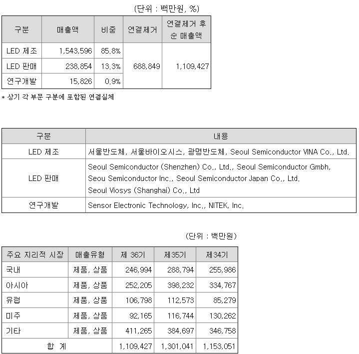 당사는 종속회사를 포함한 연결 실체 기준으로 LED 제조, LED 판매, LED 연구개발로 크게 부문을 구분할 수 있습니다.