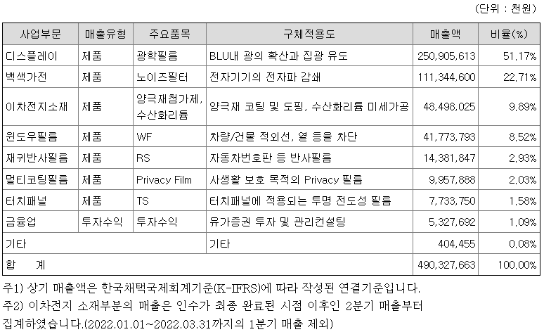 당사의 주요제품인 디스플레이용 광학필름은 제21기 말 연결기준 250,906백만원의 매출로 전체 매출액 대비 51.17%를 기록하였으며, 이차전지 소재부분은 48,498백만원의 매출로 전체 매출액 대비 9.89%를 차지하였습니다. 이차전지 소재부분의 매출은 인수가 최종 완료된 시점 이후인 2분기 매출(2022년 4월 1일 이후 누적)부터 집계하였습니다. 각 사업부문 별 제품의 특성 등의 세부내용은 'II. 사업의 내용'의 '2. 주요제품 및 서비스'를 참고하여 주시기 바랍니다.