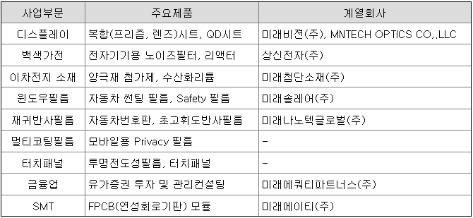 당사 및 계열회사는 디스플레이, 백색가전, 이차전지 소재 사업부문 등으로 이루어져 있으며, 사업부문별 상세내역은 다음과 같습니다.