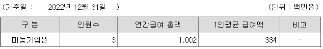 미등기임원의 평균연봉은 3억 3400만원이고 직원수는 3명입니다.