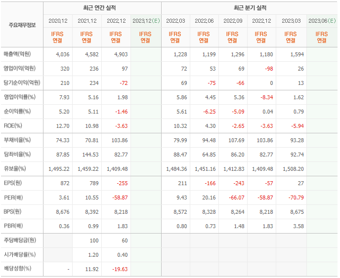 2022년 매출은 4903억, 영업이익은 97억, 당기순이익은 -72억입니다. 그리고 영업이익률은 1.98%입니다.