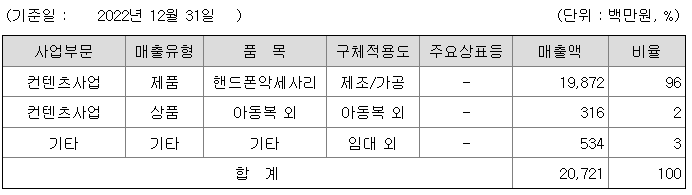 당사는 지적재산권(Intellectual Property Rights, 이하 “IP ")을 활용한 컨텐츠 제품 및 휴대폰액세서리의 제조, 판매를 주사업이자 계속 사업으로 영위하고 있습니다.