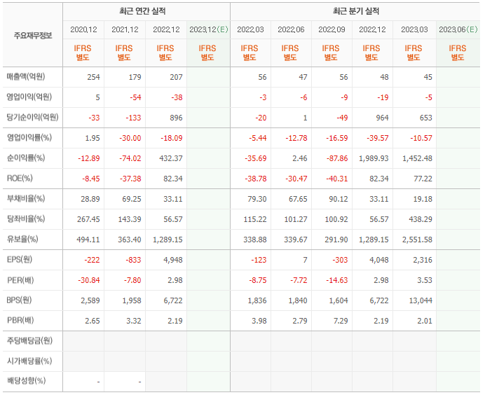 2022년 매출은 207억, 영업이익은 -38억, 당기순이익은 896억입니다. 그리고 영업이익률은 -18.09%입니다.