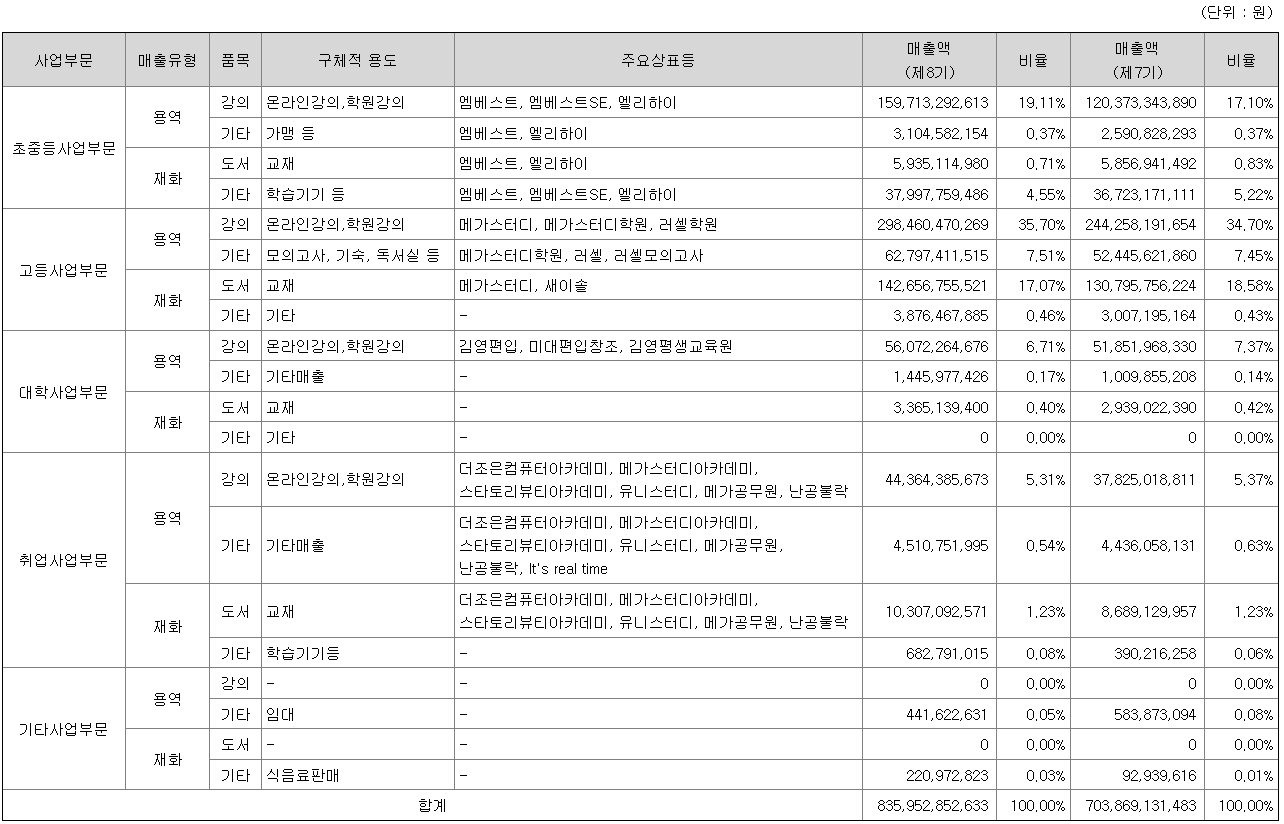 사업부문별로 보면 ▲초ㆍ중학생을 대상으로 온ㆍ오프라인 강의 서비스를 제공하는 초중등사업부문 ▲고등학생과 재수생을 대상으로 온ㆍ오프라인 교육서비스를 제공하는 고등사업부문 ▲대학편입학 준비생등을 대상으로 온ㆍ오프라인 강의 서비스를 제공하는 대학사업부문 ▲취업 준비생등을 대상으로 온ㆍ오프라인 강의 서비스를 제공하는 취업사업부문 ▲그 외 임대사업 등의 기타사업부문 등으로 구성되어 있습니다. 이와 함께, 사업부문별로 온라인강의, 학원강의 등의 용역을 제공하고 도서 등의 재화를 판매하고 있습니다.