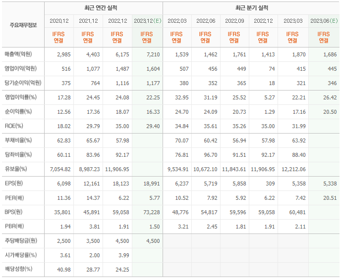 2022년 매출은 6175억, 영업이익은 1487억, 당기순이익은 1116억입니다. 그리고 영업이익률은 24.08%입니다.