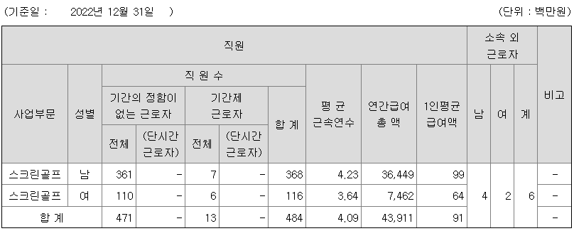 | 사업부문 | 성별 | 직원수 | 평균근속연수 | 평균연봉(백만) |