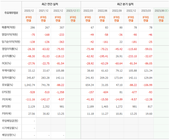2022년 매출은 307억, 영업이익은 -233억, 당기순이익은 -363억입니다. 그리고 영업이익률은 -75.93%입니다.