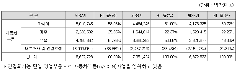 당사는 자동차용 에어컨(HVAC)과 파워트레인 쿨링(PTC), 압축기(COMP), 플루이드 트랜스포트(FT), 유압제어장치(E&FP) 등을 생산하는 자동차 공조제품 전문 제조회사로서, 각 지역별 매출액 및 총 매출액에서 차지하는 비율은 아래와 같습니다.