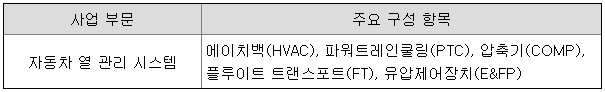 당사는 OEM(주문자생산방식) 납품을 주로 하는 자동차 열 관리 시스템 단일품목 제조회사로서 한국내에는 대전공장, 평택공장, 울산공장, 아산공장, 경주공장을 보유하고 있으며 본사 및 해외법인 모두 자동차의 열 관리 시스템을 생산하는 단일 사업부문을 영위하고 있습니다.