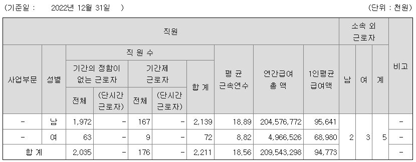 | 사업부문 | 성별 | 직원수 | 평균근속연수 | 평균연봉(백만) |