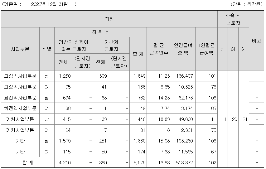 | 사업부문 | 성별 | 직원수 | 평균근속연수 | 평균연봉(백만) |