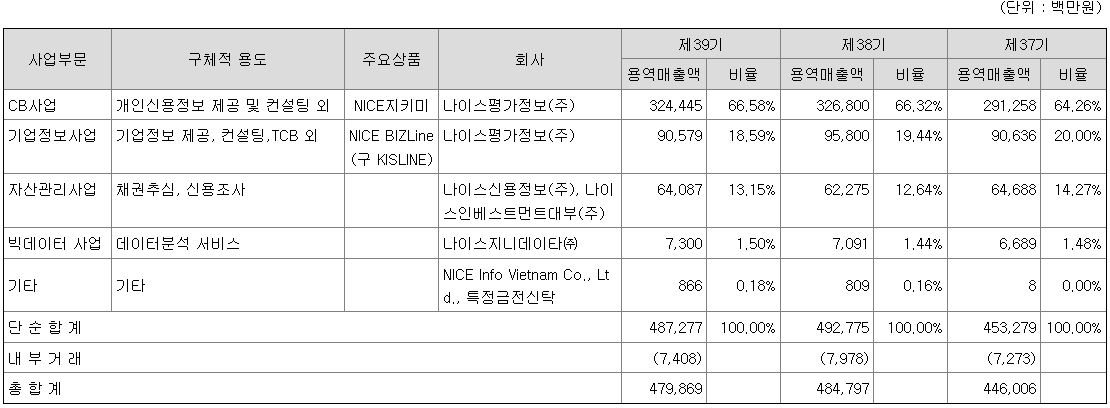 당사는 개인신용정보, 기업정보, 자산관리부문으로 주요 제품의 판매 및 용역을 제공하고 있습니다. 각 서비스별 매출액 및 총 매출액에서 차지하는 비율은 다음과 같습니다.